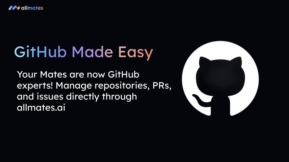 We are thrilled to announce one of our most powerful integrations for developers: the GitHub Operations tool is now live on allmates.ai! Stop switching tabs and start managing your entire development lifecycle directly through your Mates.