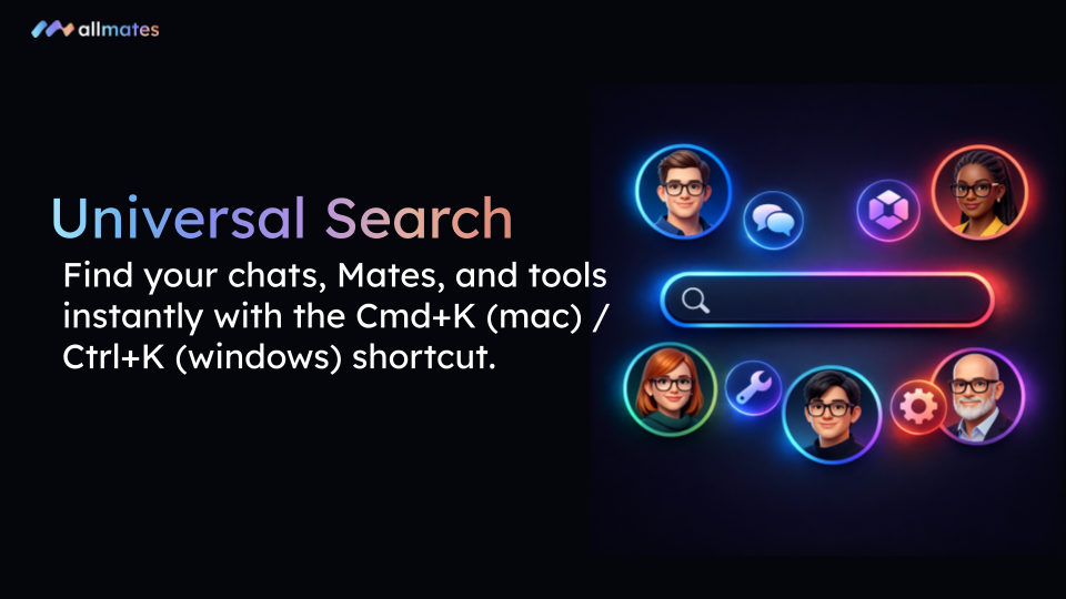 Universal Search (Cmd+K / Ctrl+K): Stop scrolling through endless lists. Instantly access your private chats, Workspaces, Mates, or favorite tools via an ultra-fast search interface.
