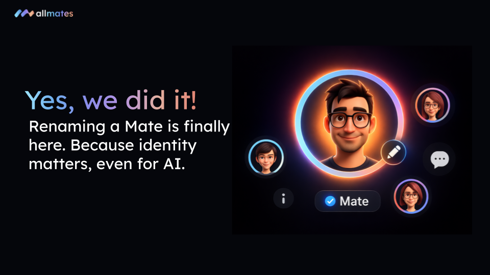Behind the scenes at allmates.ai, renaming a Mate is like a full legal name change in a government database. To keep your conversations coherent, every past mention and future interaction had to stay perfectly synced. After some serious architectural heavy lifting, the most-requested "obvious" feature is finally live.