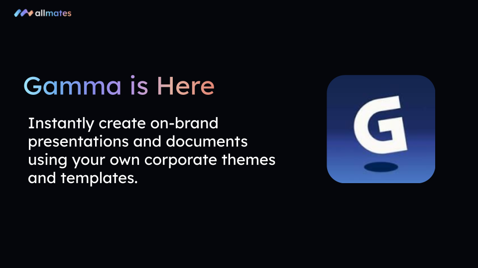 • Guaranteed Brand Consistency: Use your company's official Gamma themes and templates directly within allmates.ai. The Gamma Designer ensures every creation perfectly matches your brand identity.